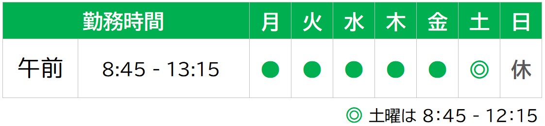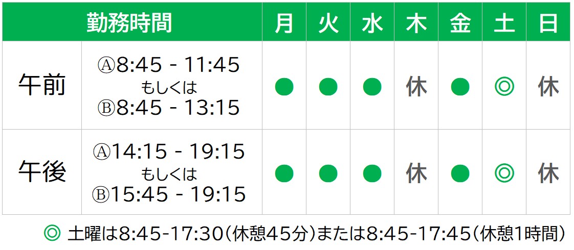 【常勤】 月火水金 午前 8:45 - 11:45 午後 14:15 - 19:15 木曜 8:45 - 13:15 土曜 8:45 - 17:45(休憩60分) 小児科と内科(同じ建物2階と3階の連携施設)での勤務。 上記の中から、週32-40時間の範囲で両方で働くシフトを組みます。 (※一例はこちら) 勤務時間の希望、ご相談ください。(午前多めなどは相談可、土曜や夕診0スタートは常勤では不可) 【パート、アルバイト】 ■めぐみ内科・糖尿病内科 9:00 - 13:00 土曜は月2回9:00-12:00 ※糖尿病療養指導士の看護師の方や超音波検査可能な臨床検査技師の方は勤務時間相談可(9:30~12:00など) ■森下小児科アレルギー科 午前診 9:00 - 11:30 ワクチン・検診 14:30 - 16:00 夕診 16:00 - 19:00 土曜 9:00 - 12:00、13:00 - 16:00 ※ 看護師・検査技師パートは週1-3勤務OK。